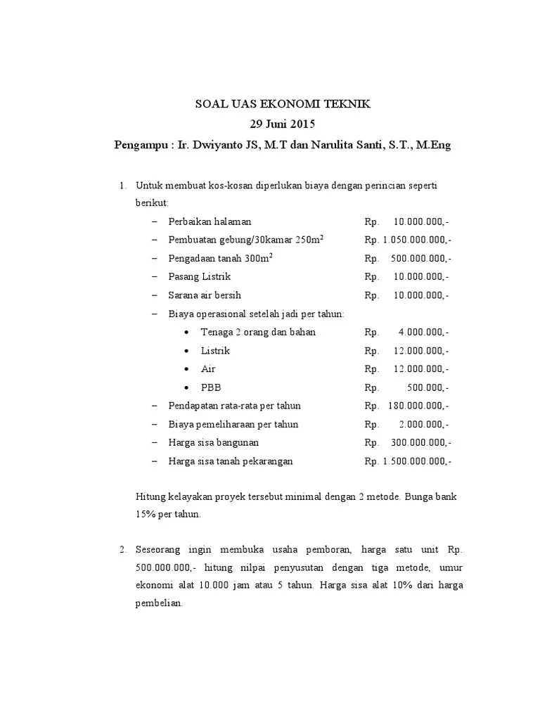 Contoh Soal Ekonomi Teknik : Latihan Soal Uas Ekonomi Teknik 2016 Pdf / Tentukan apakah proyek layak secara ekonomi dengan metode irr.